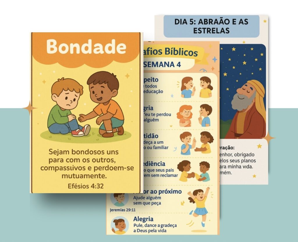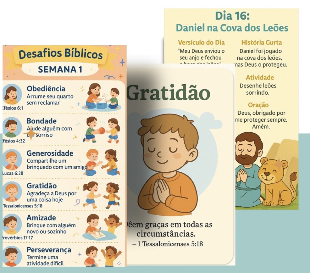 Esse método é eficaz porque promove o aprendizado ativo – seu filho não só ouve, mas pensa e responde. Também gera uma memória emocional positiva, transformando o fim do dia em um momento especial com você e com Deus. E com o desafio diário, o ensino bíblico se torna ação concreta na rotina da criança.